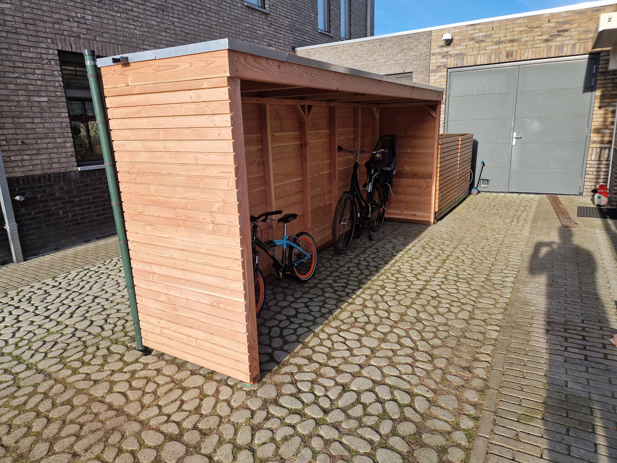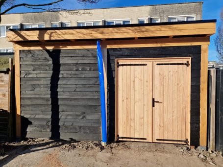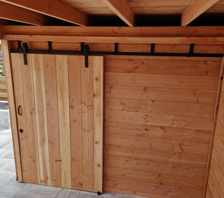 Douglas overkapping met gedeelte schuur. Binnenzijde Douglas schuifdeur.