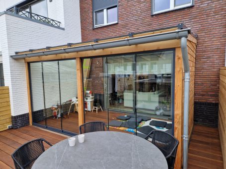 Douglas hout in de zwarte beits gezet. Getinte glazen schuifdeuren.
