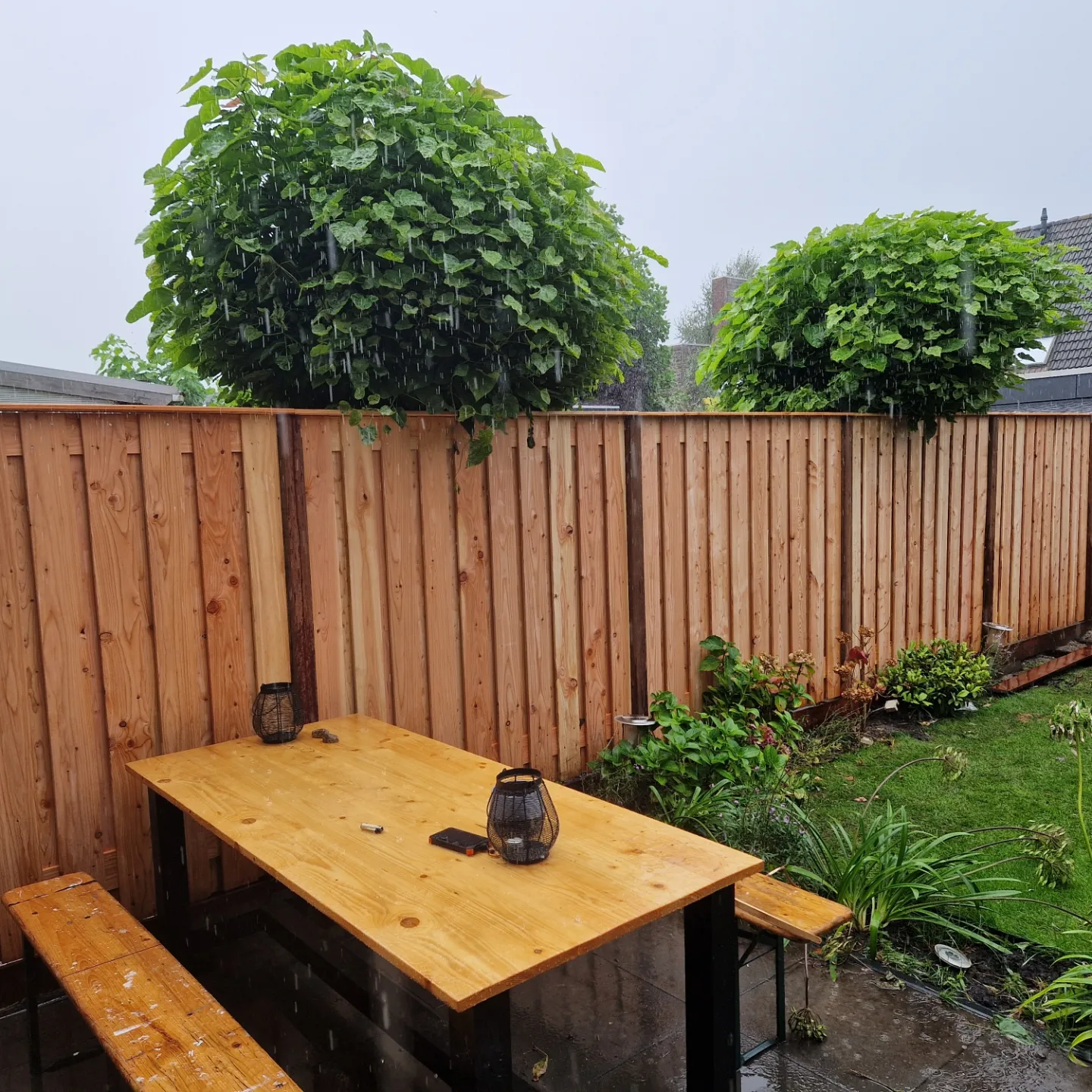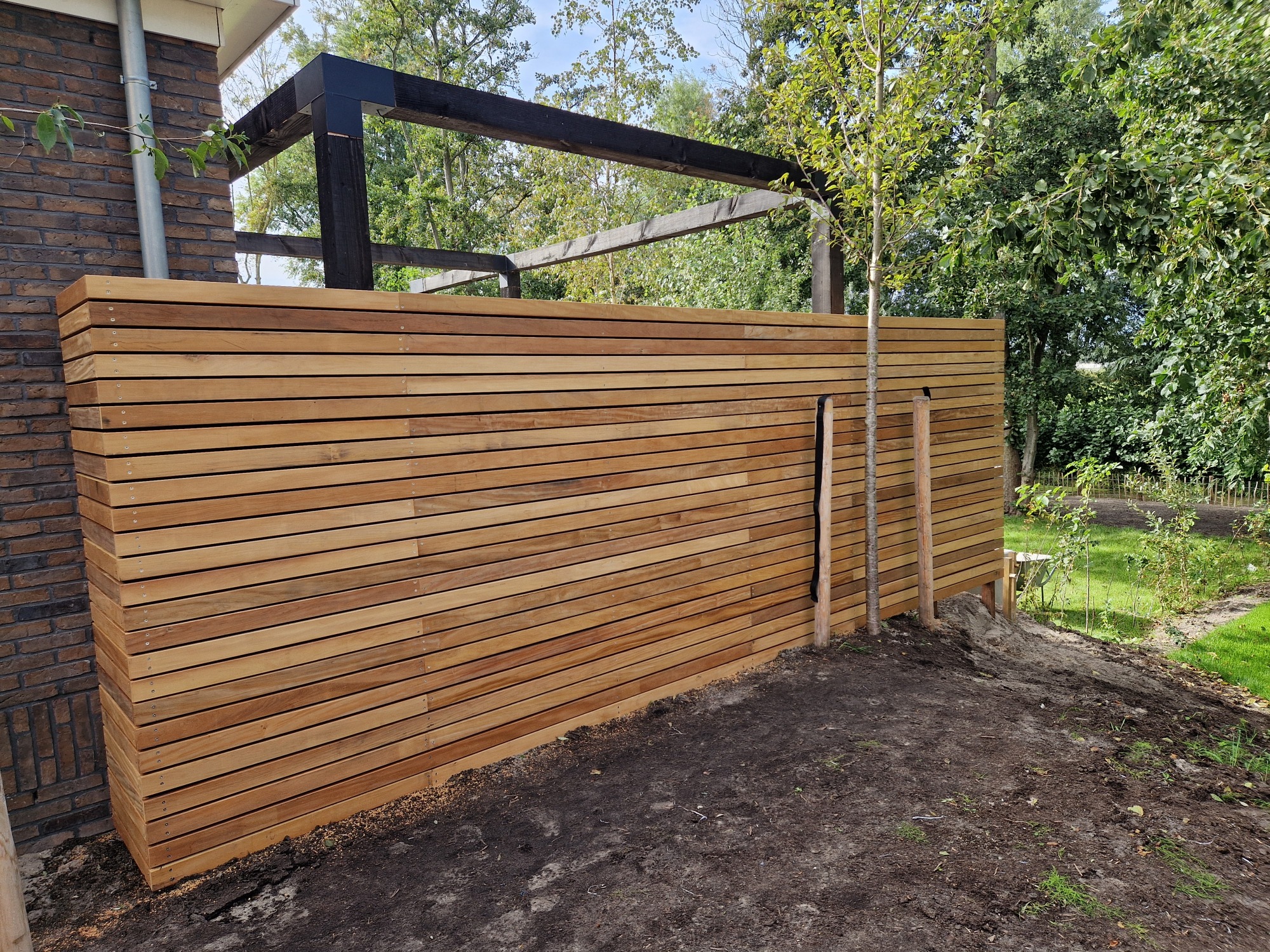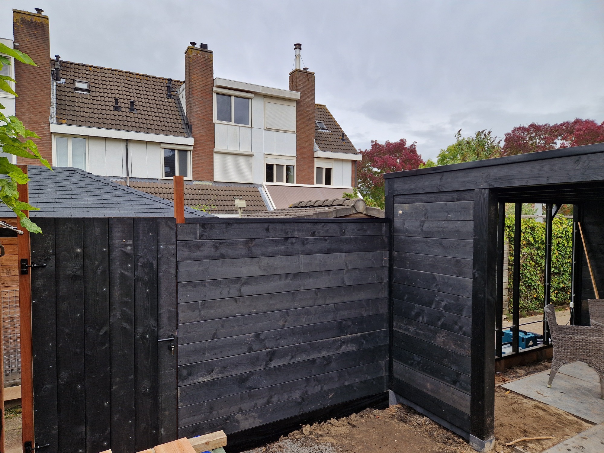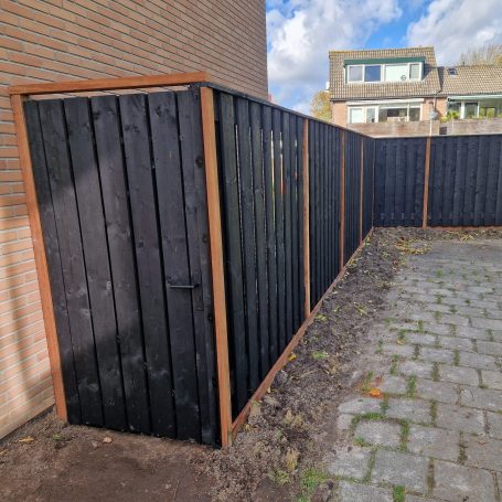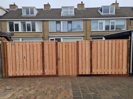 Afwerking half-lips vuren planken 1.8 x 17.5 cm geschaafd. Dezelfde planken lopen door in de schutting en poortdeur wat een strakke en rustige eenheid creëert.