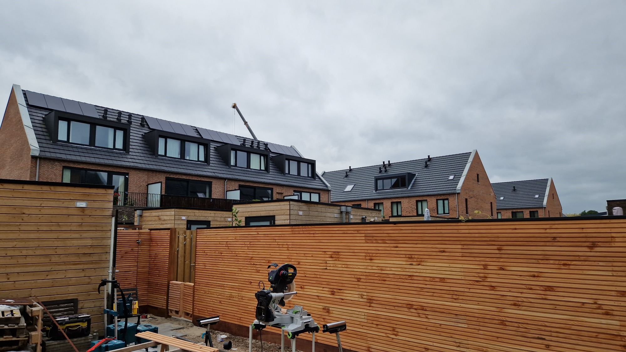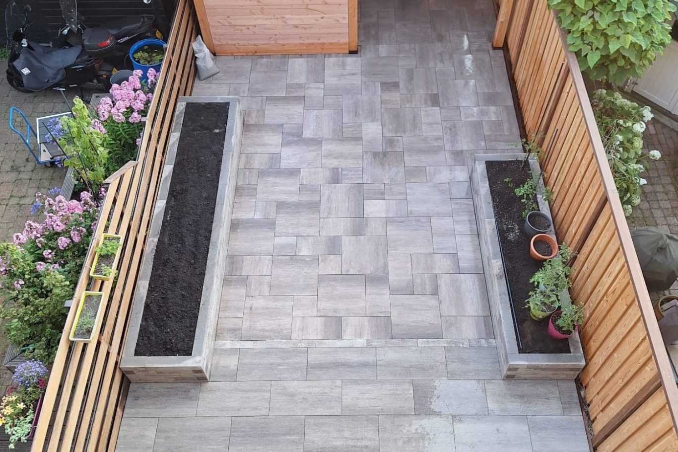 Tijdens de werkzaamheden. Hardhouten plank onder om tegen aan te straten of planten te poten.
