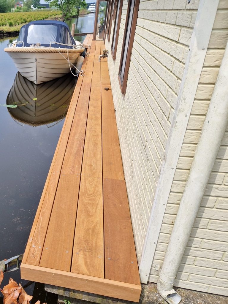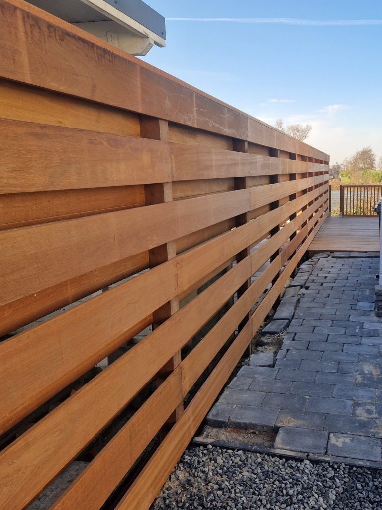 Dit is een harde houtsoort met een levensduur van +- 20 a 25 jaar. Verkrijgbaar in verschillende maten en diktes. Hoeft niet behandeld te worden maar zal door weersinvloeden vergrijzen.